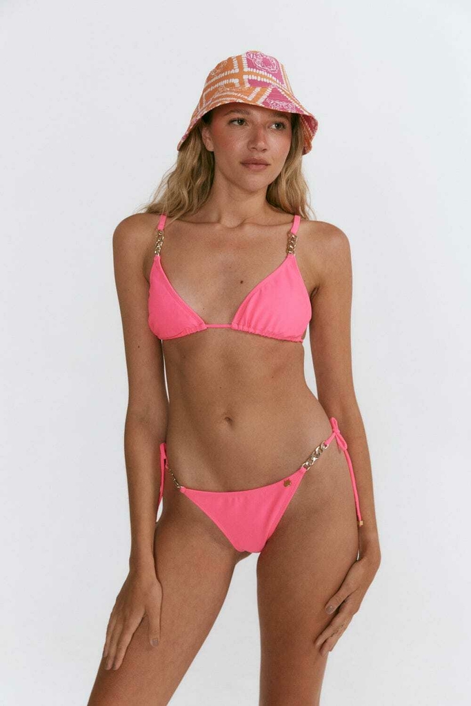 La bombacha de tiritas para atar regulables es un complemento perfecto para este conjunto. El diseño de esta bombacha fusiona a la perfección moda y funcionalidad, y su toque distintivo es la cadena dorada a prueba de agua. Las terminales cúbicas de zamak elevan aún más el atractivo general de la prenda. Al igual que el corpiño, el interior de la bombacha está forrado para un confort óptimo. Además, puedes elegir entre la vedetina clásica o la tanga, según tus preferencias personales.